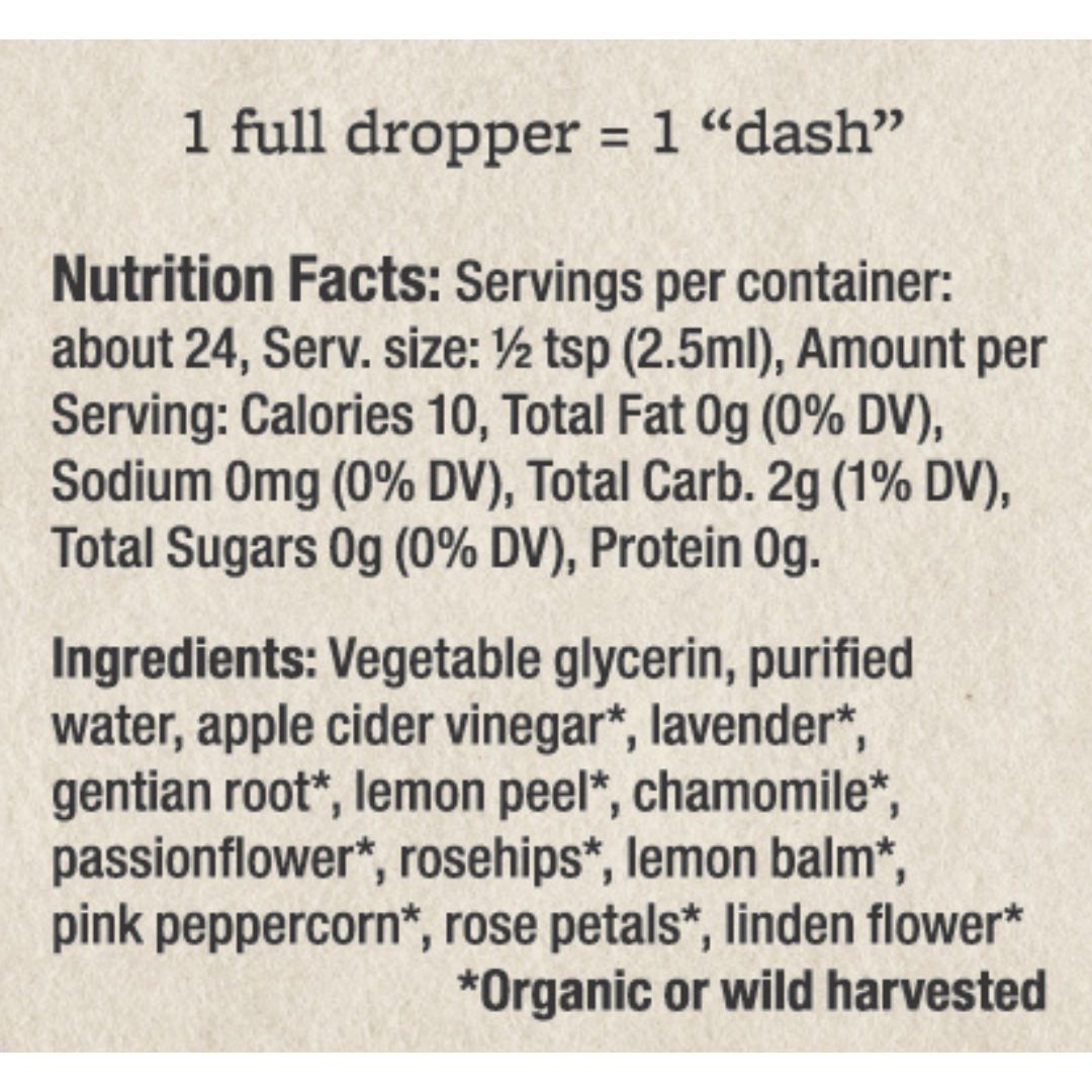 Ingredients: Vegetable glycerin, purified water, apple cider vinegar*, lavender*, gentian root*, lemon peel*, chamomile*, passionflower*, rosehips*, lemon balm*, pink peppercorn*, rose petals*, linden flower* *Organic or wild harvested ingredients.