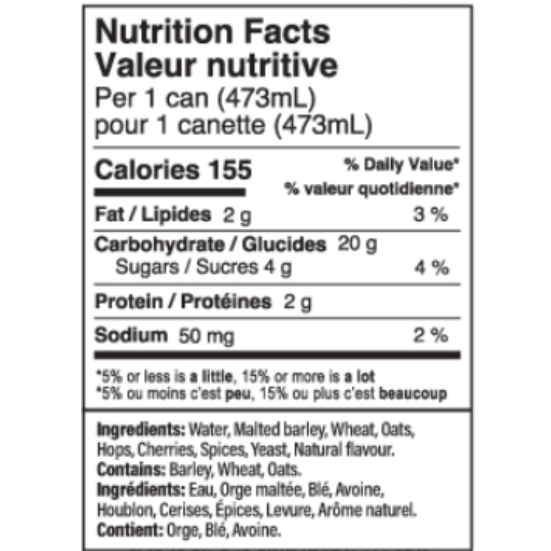 Ingredients: Water, malted barley, wheat, oats, hops, cherries, spices, yeast, natural flavour.