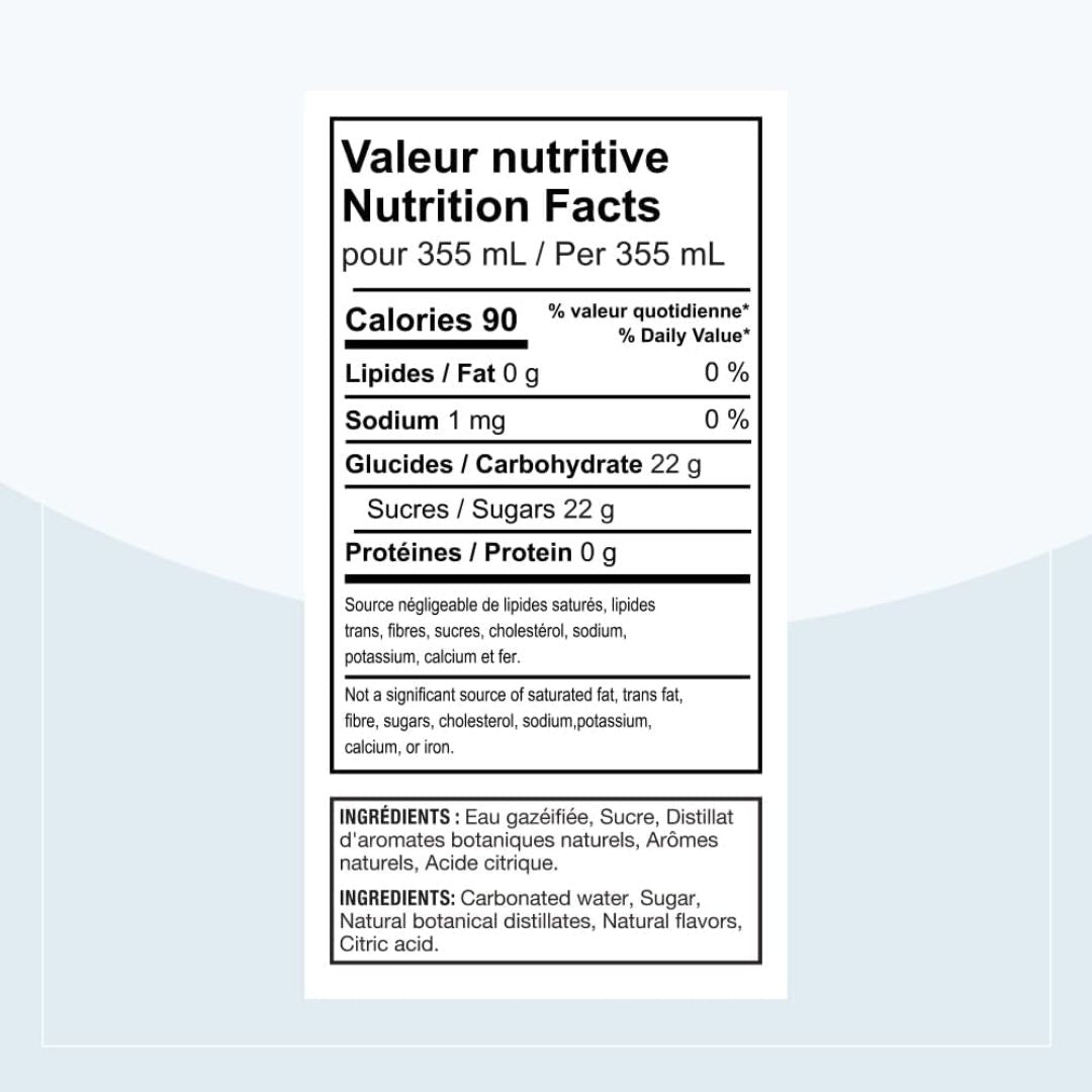 Ingredients: Carbonated water, Sugar, Natural botanical distillates, Natural flavors, Citric acid