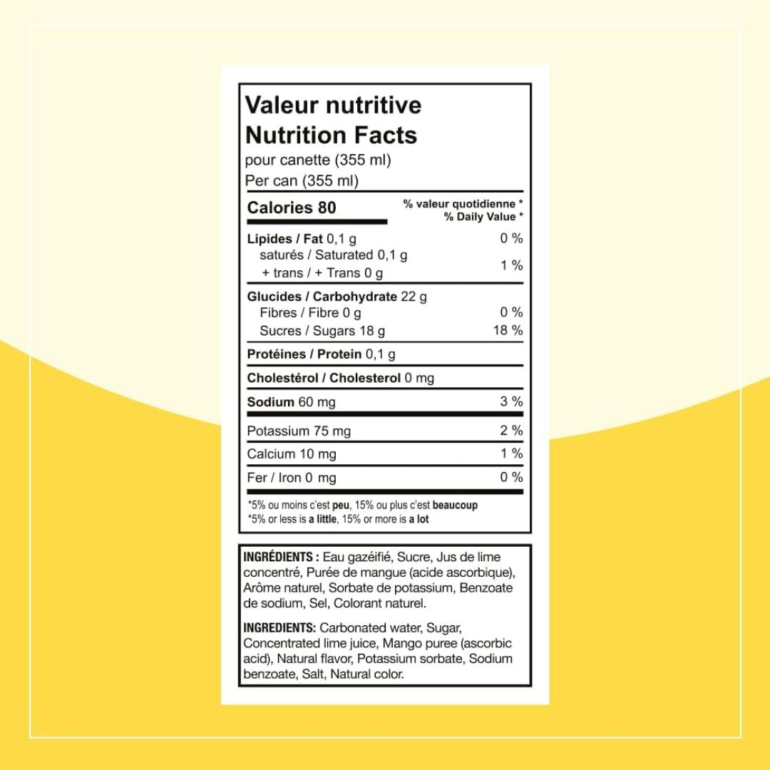 Ingredients: Carbonated water, Sugar, Concentrated lime juice, Mango puree (ascorbic acid), Natural flavor, Potassium sorbate, Sodium benzoate, Salt, Natural color.