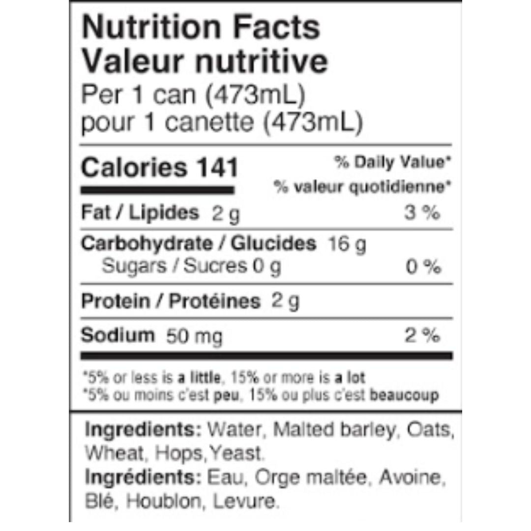 Ingredients: Water, malted barley, oats, wheat, hops, yeast.