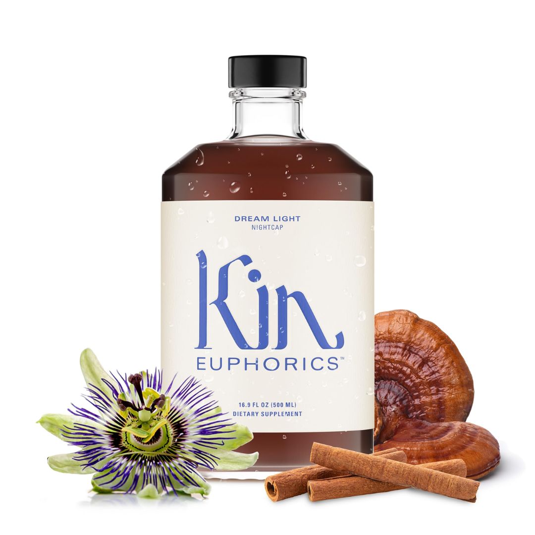 Drift off to dreamland. Non-alcoholic, non-caffeinated Kin - Dream Light is a made-to-mix beverage infused with adaptogens, nootropics, and botanics like Reishi Mushroom, Melatonin, and L-Tryptophan to quiet your mind, release what’s beyond your control, and help you reach a natural circadian rhythm for deeper, more restful sleep.