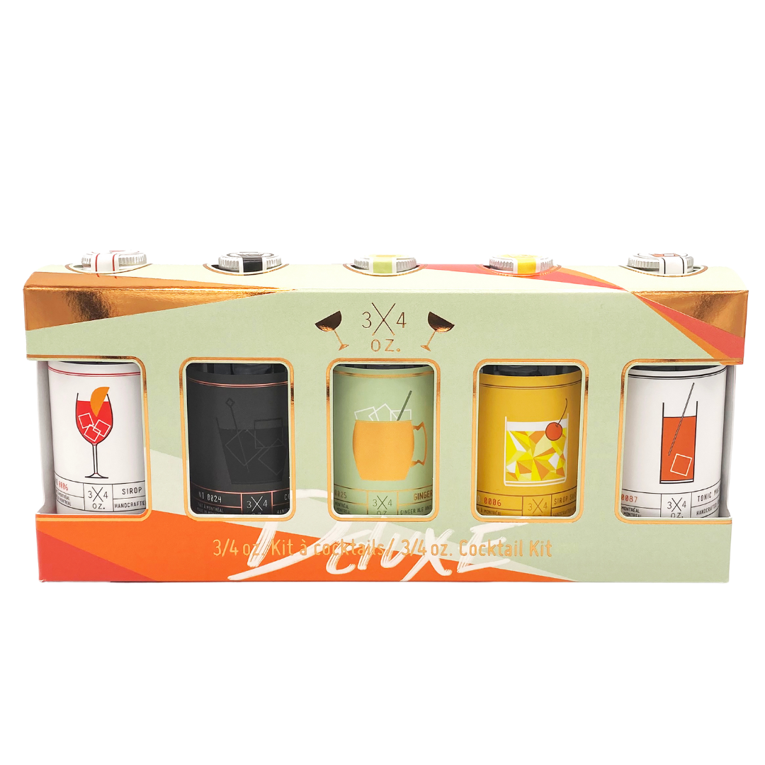 Le kit cocktail Deluxe de 3/4 oz contient des sirops artisanaux pour préparer plusieurs cocktails classiques, notamment : Gin & Tonic, Rhum & Coca, Moscow Mule, Margaritas et Spritz.