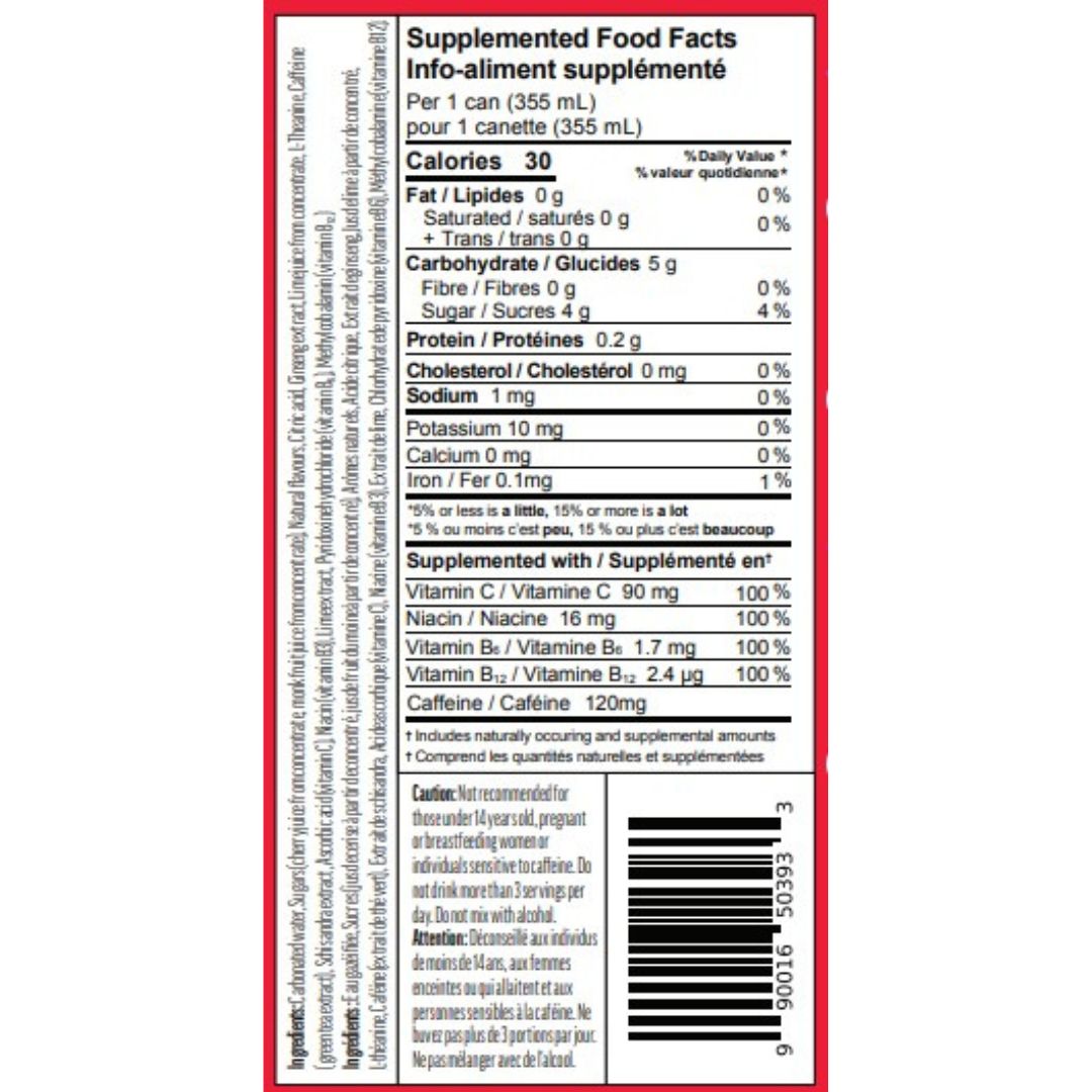 Ingrédients : Eau gazeuse, sucres (jus de cerise à base de concentré, jus de fruit du moine à base de concentré), arômes naturels, acide citrique, extrait de ginseng, jus de citron vert à base de concentré, L-Théanine, caféine (extrait de thé vert), extrait de schisandra, acide ascorbique (vitamine C), niacine (vitamine B3), extrait de citron vert, chlorhydrate de pyridoxine (vitamine B₆), méthylcobalamine (vitamine B₁₂).