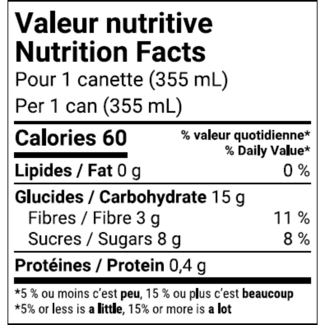 Ingrédients: Eau filtrée, sucres (sucre de canne biologique, jus de framboise concentré biologique, fruit du moine concentré biologique), jus de citron concentré biologique, arômes naturels biologiques, inuline d'agave biologique, thé vert biologique, matcha japonais biologique, bacillus subtilis DE111® (probiotique végétalien).