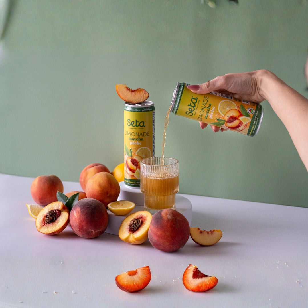 Seta - Limonade au Matcha - Pêche est une fusion rafraîchissante de matcha japonais Biologique et de la douceur des pêches mûres. Avec 50mg de caféine naturelle provenant du thé vert, cette boisson à base de plantes offre un léger coup de boost. Infusée avec 1 milliard de CFU de probiotiques Végétalien et 3g de fibres prébiotiques, elle est conçue pour soutenir un intestin sain. Avec seulement 8g de sucre par boîte et sans stévia, c’est l’équilibre parfait entre saveur et bien-être.