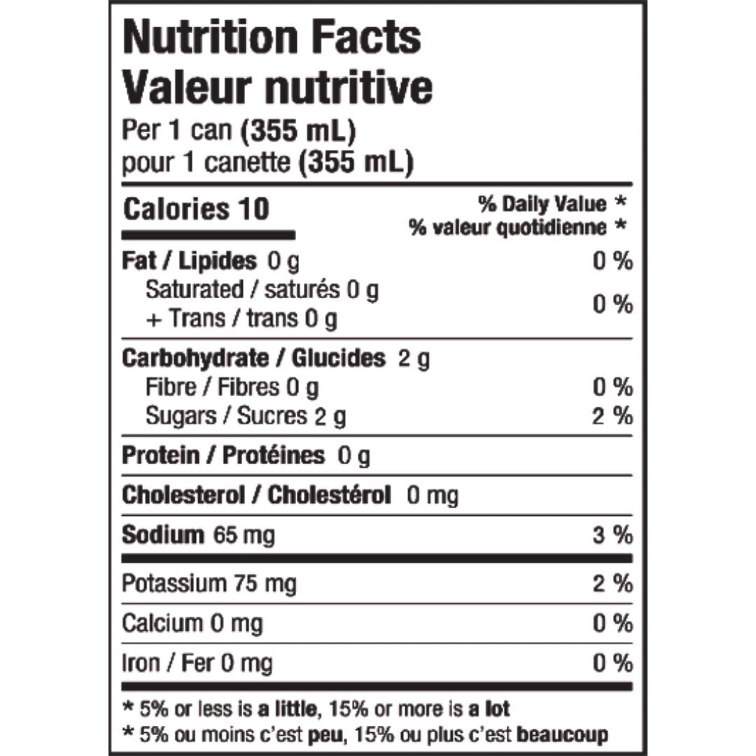 IIngrédients : Eau gazéifiée purifiée, arômes naturels, sucre de canne, acide citrique, électrolytes (phosphate monopotassique, citrate de sodium, sel marin), jus de mangue concentré.