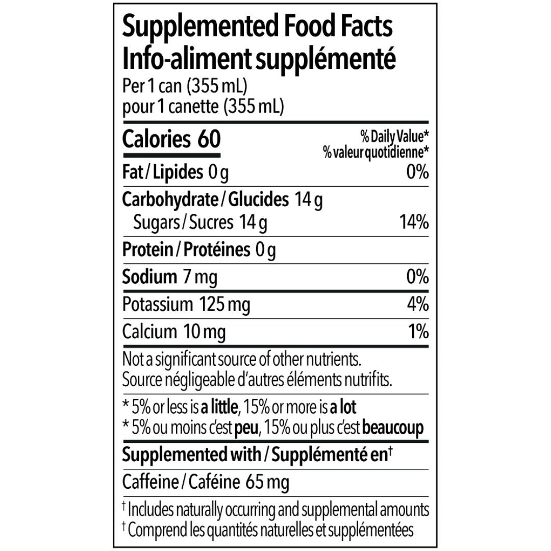 Ingrédients : Infusion de yerba maté* (eau gazéifiée, yerba maté*) • Sucres (sucre de canne* • concentré de jus de pêche*) • Acide citrique • Extrait de yerba maté* • Arôme naturel *Biologique