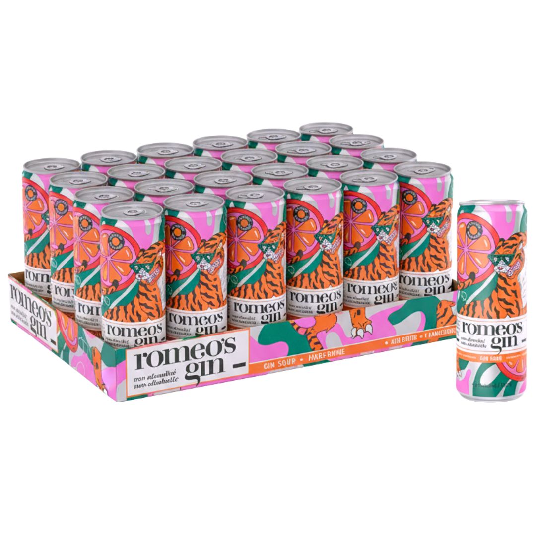 Découvrez le nouvel ajout passionnant à la gamme sans alcool de Romeo's, un gin sour aux saveurs douces d'amaretto et de mandarine juteuse, équilibrées par une acidité vive et persistante. Une création audacieuse inspirée du favori du bar Amaretto Sour, réinterprétée avec une touche de notes de gin de genièvre et de bulles pétillantes pour une touche de fraîcheur. Le design lumineux et coloré de la canette a été créé par la célèbre artiste Dalkhafine, qui partage son temps entre Montréal et Paris.