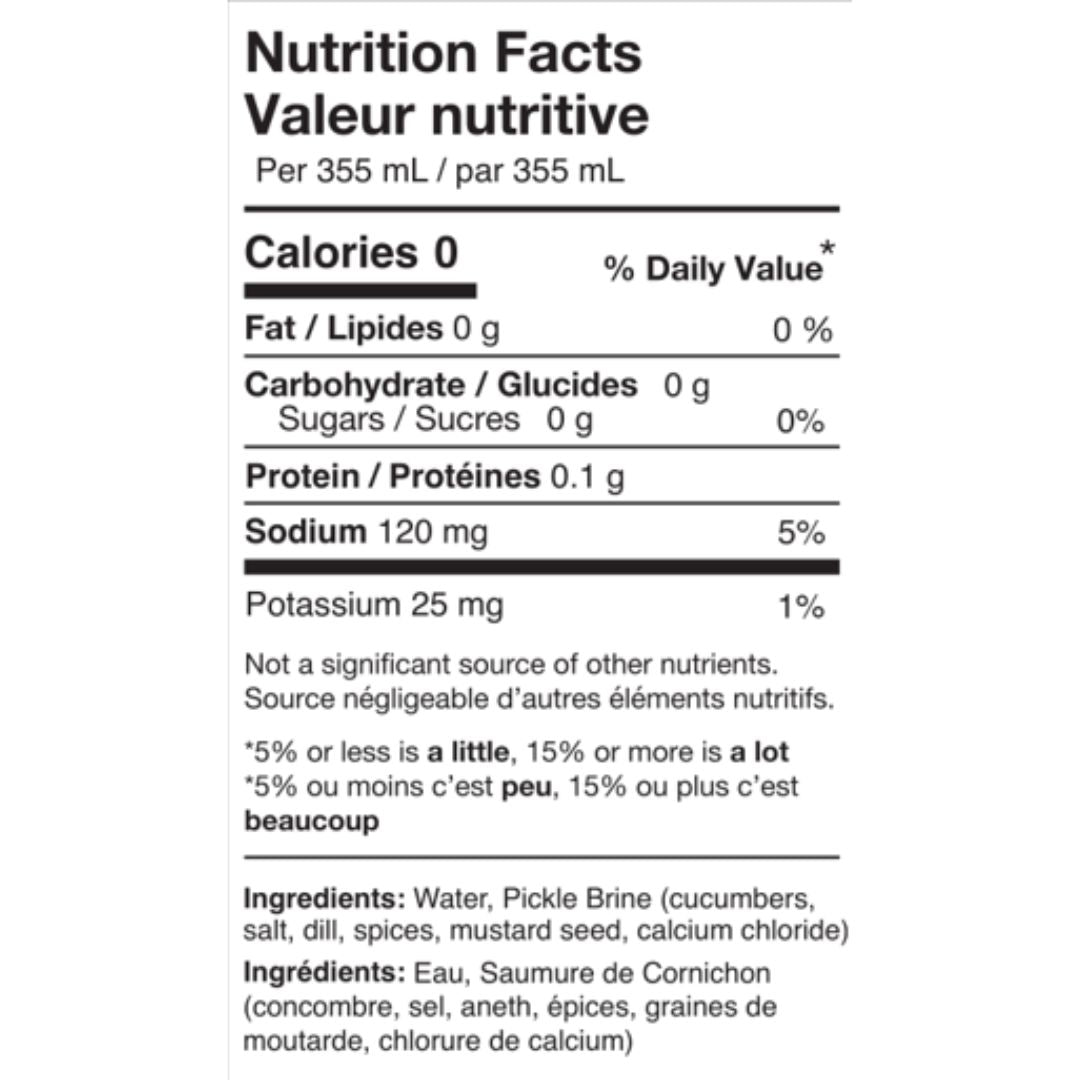 Ingredients: Water, Pickle Brine (cucumbers, salt, dill, spices, mustard seed, calcium chloride)
