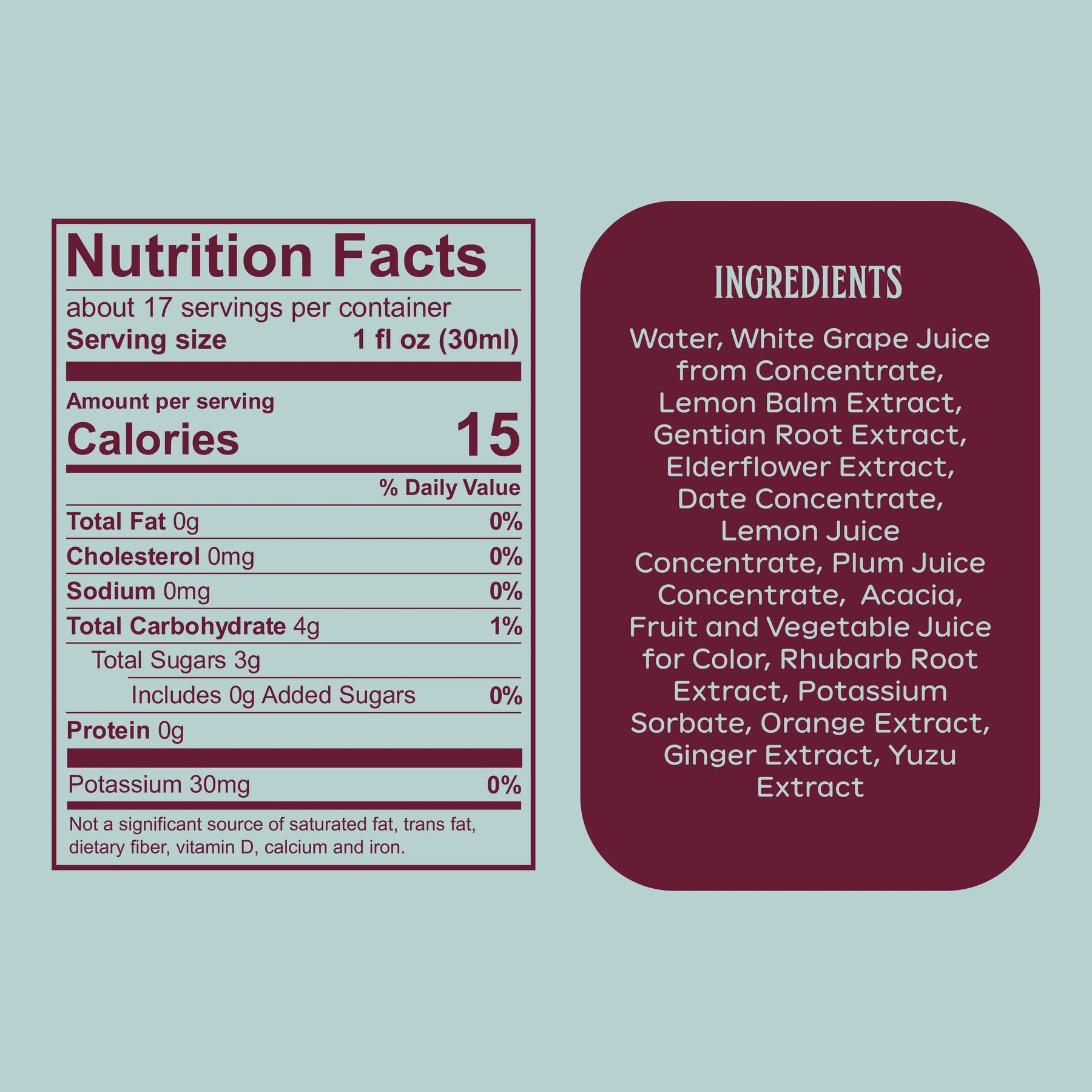 Ingredients:Water, Strawberry Juice from Concentrate, Black Currant Juice from Concentrate, Date Concentrate, Chamomile Tea (water, extract), Lapsang Souchong Tea (water, extract), Gentian Root Extract, Acacia, Cardamom Extract, Honeysuckle Extract, Orange Peel Extract, Holy Basil Extract, Clove Extract, Orris Root Extract, Hibiscus Extract, Vitamin C (as ascorbic acid), Orange Blossom Extract, Potassium Sorbate, Rosemary Extract.