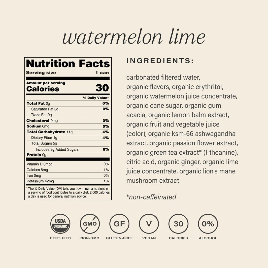 Ingredients: Carbonated filtered water, organic flavors, organic erythritol, organic watermelon juice concentrate, organic cane sugar, organic lime juice, organic green tea extract (l-theanine)*, organic ksm-66 ashwagandha extract, organic cordyceps mushroom extract, organic ginger extract, organic turmeric extract, organic fruit and vegetable juice (color), citric acid, organic gum acacia, organic lion's mane mushroom extract | *non-caffeinated